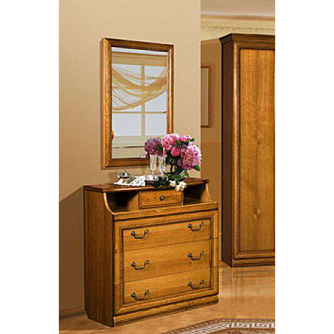 Оригинальный комод в классическом стиле из коллекции «Нинель» от белорусской фабрики «Молодечномебель» выполнен из натурального дуба в цвете табак с патиной. Три просторных ящика для белья и небольшой для украшений делают этот предмет мебели не только стильным, но и очень удобным.