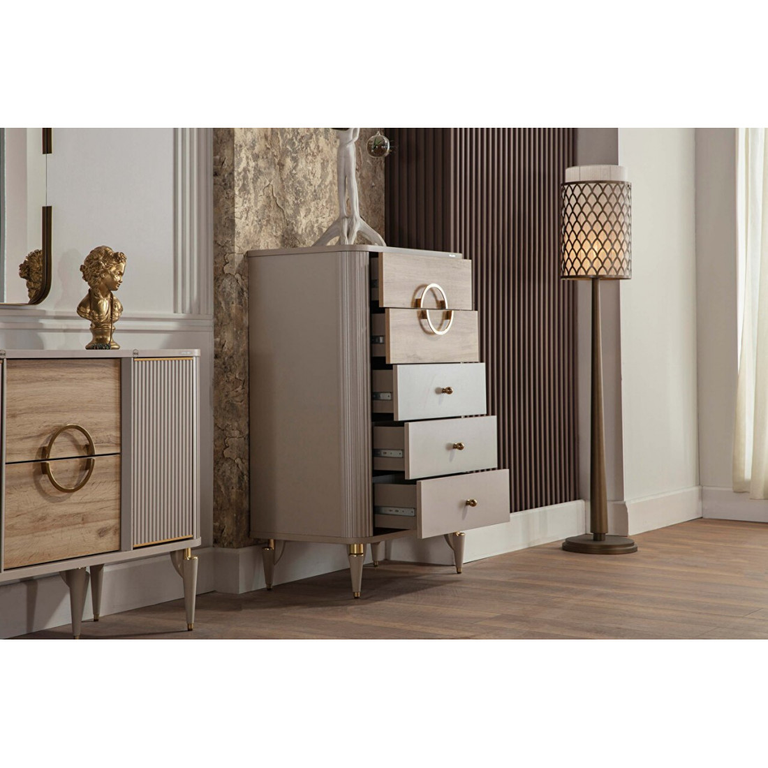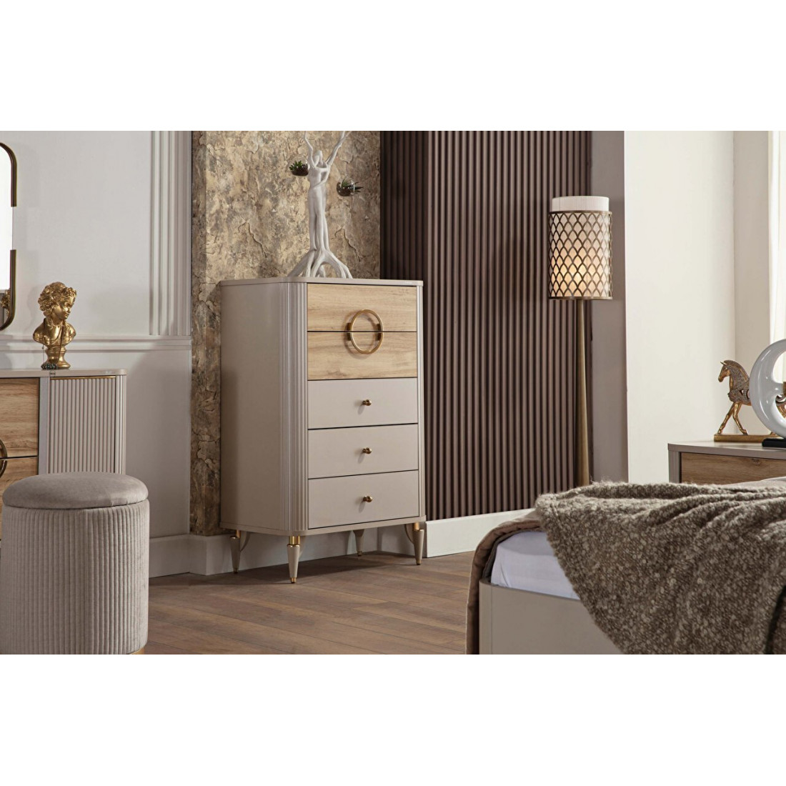 Высокий комод для белья Санвито SANV-28 незаменимый атрибут в Вашей спальне. Благодаря своим небольшим габаритам, ширина 760мм, и высота 1180мм, прекрасно встанет в  любоv месте интерьера. Пять вместительных ящиков для хранения вещей. Комод продолжает турецкую линейку мебели SANVITO  под брендом Bellona. Отличительной особенностью этой коллекции является сочетание разных фактур покрытия фасадов. фасады ящиков в кремовом цвете и матовые древесные фасады. Украшением комода выступают оригинальные ножки с золотистой отделкой, ручки капельки и дизайнерский венец в виде большого кольца на верхних фасадах.