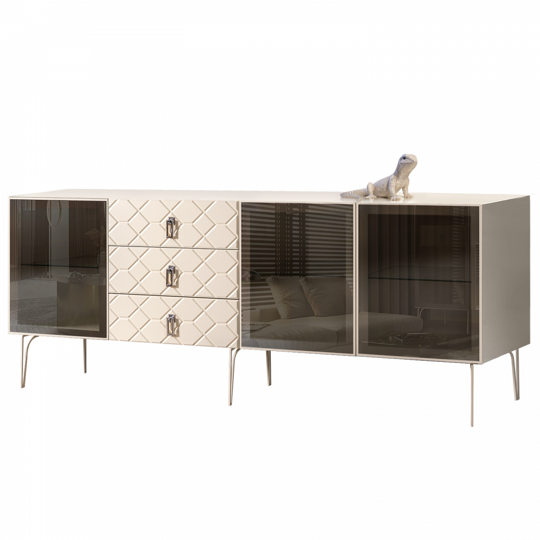 Стекло Stopsol меняет свои отражающие свойства под воздействием источников света. Поверхность, отражающая свет, мягко скроет содержимое вашего комода или витрины.