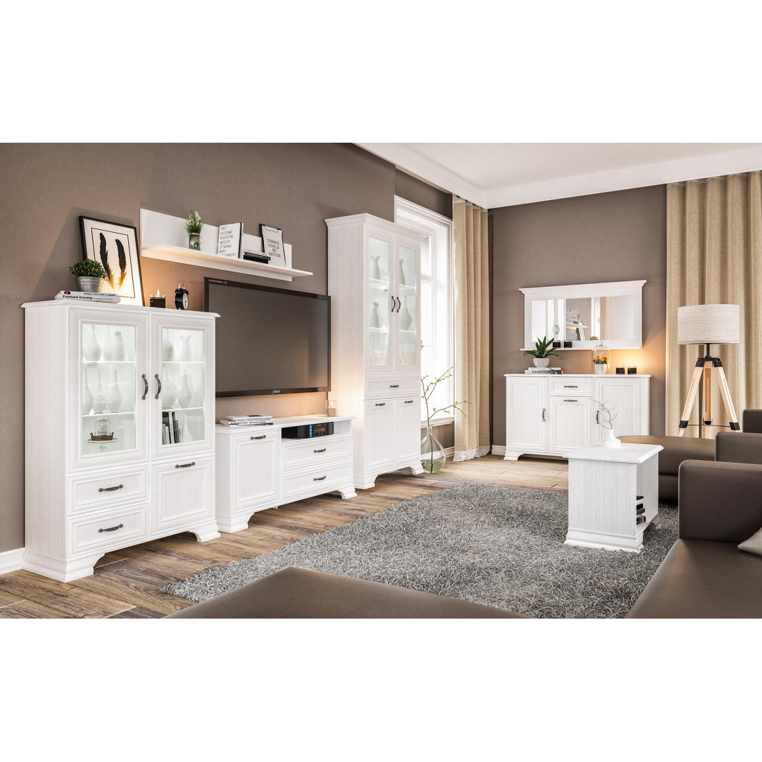 Мебель для гостиной Юнона композиция 2 от фабрики Мебель-Неман - это новинка 2019 года в классическом стиле с отделкой структурной фактуры, обрамленная рамочным фасадом, где металлические ручки выгодно подчёркивают стиль и изящество, всегда актуальна и востребована. Полки у шкафов-витрин и тумбы - стеклянные.