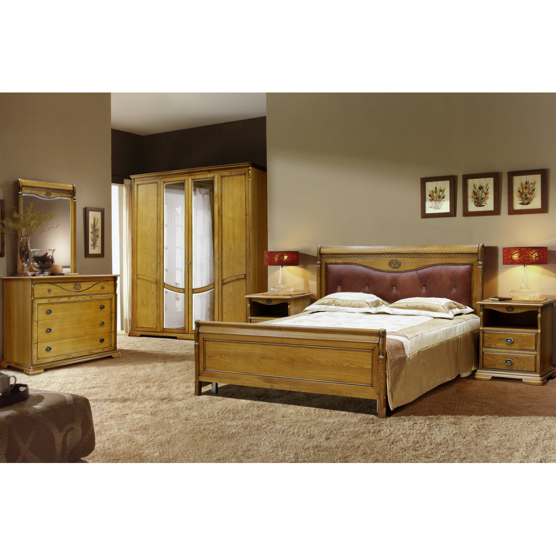 Благородная древесина дуба, резной орнамент, плавные линии брусков, фурнитура с оттенком старины, мягкая спинка кровати создают атмосферу покоя и защищенности. Стол туалетный в виде трильяжа будет находкой для тех, кто любит следить за своей внешностью, так как он позволяет оценить ее не только спереди, но и со всех сторон.