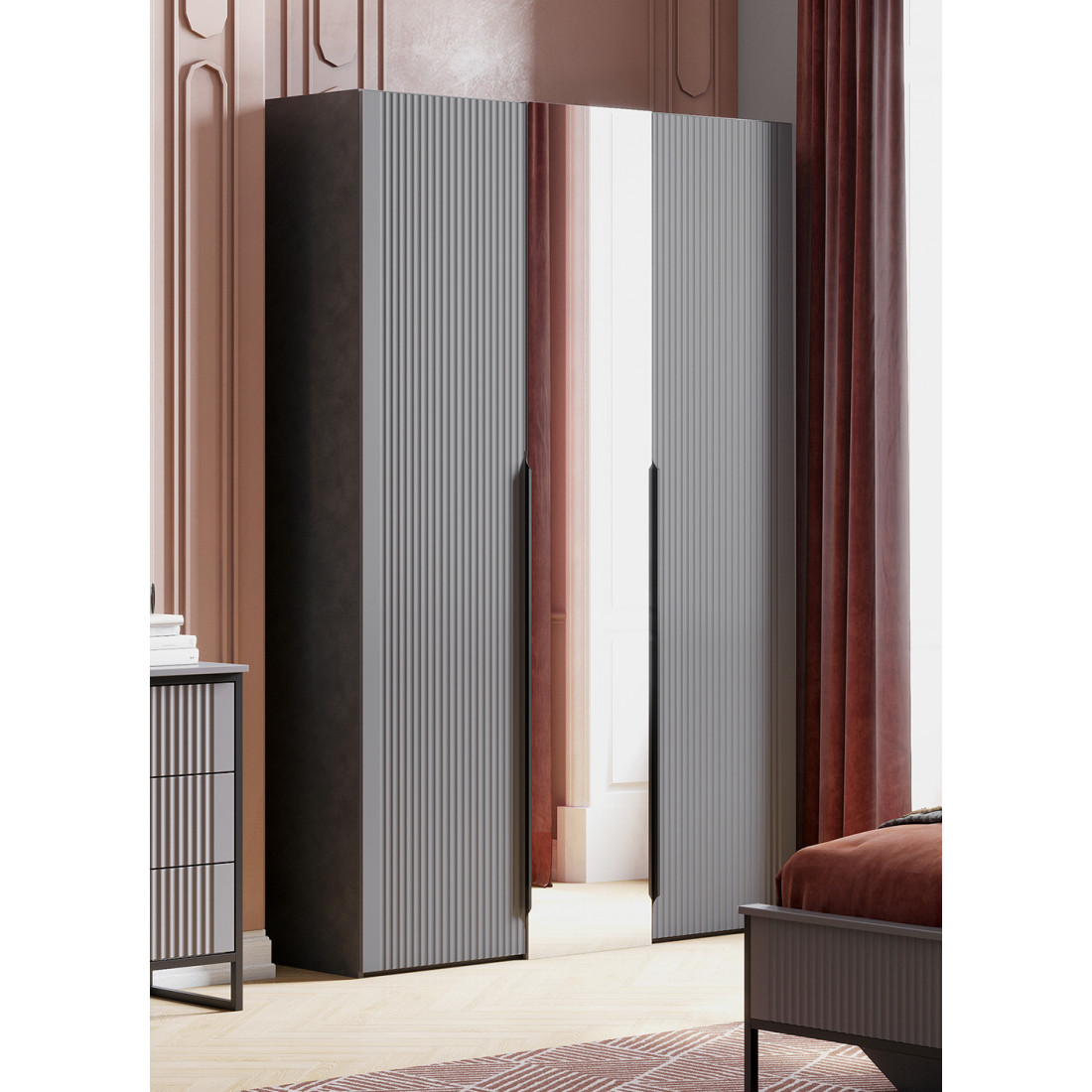 Коллекцию модульной спальни "Нора" отличает современный оригинальный стиль. Декоративная продольная фрезеровка на МДФ фасадах цвета "Графит" и опоры на металлокаркасе цвета "Черная эмаль" соответствуют модным тенденциям этого года в ведущих зарубежных